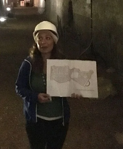 A tour guide in the remains of the Gold House displays a schematic of its plans. (Photo: Author)