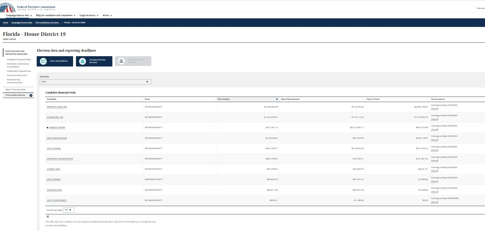 Under the Federal Election Campaign Act of 1971 candidates for federal office are obligated to file quarterly reports of their fundraising and contributors, including the specific names of individuals and organizations contributing and the amounts. Collins filed as a candidate with the Florida Department of State in June 2025. If he started raising and spending campaign money last year he should have begun filing reports then.