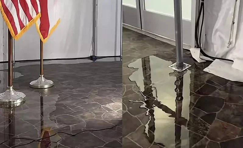 Water covers the floor of the tent where officials spoke for the opening of Alligator Alcatraz. (Photos: TikTok via AnnaforFlorida)