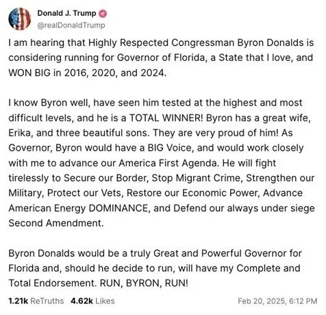 Donald Trump’s endorsement of Rep. Byron Donalds on Feb. 20, 2025.